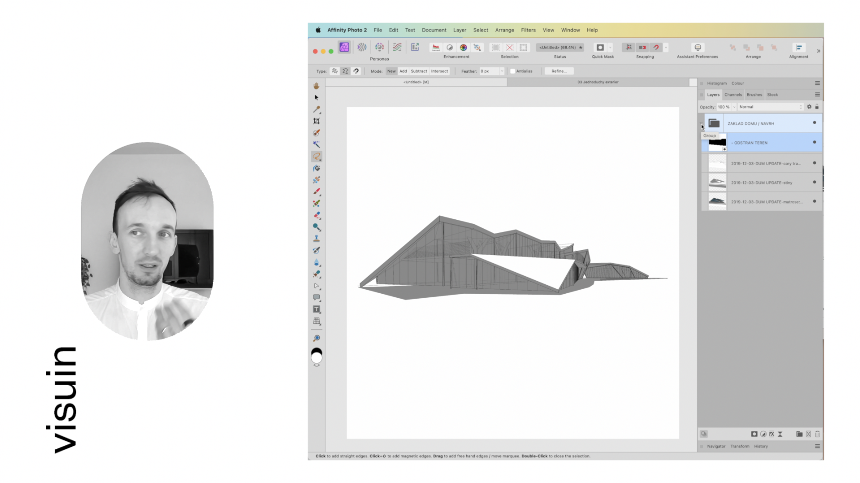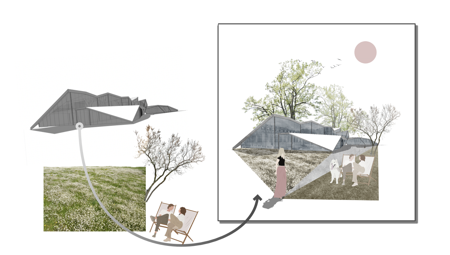 Z přiložených podkladů (čáry, stíny, materiály) si skrze prolnutí vytvoříme základ návrhu k vizualizaci.